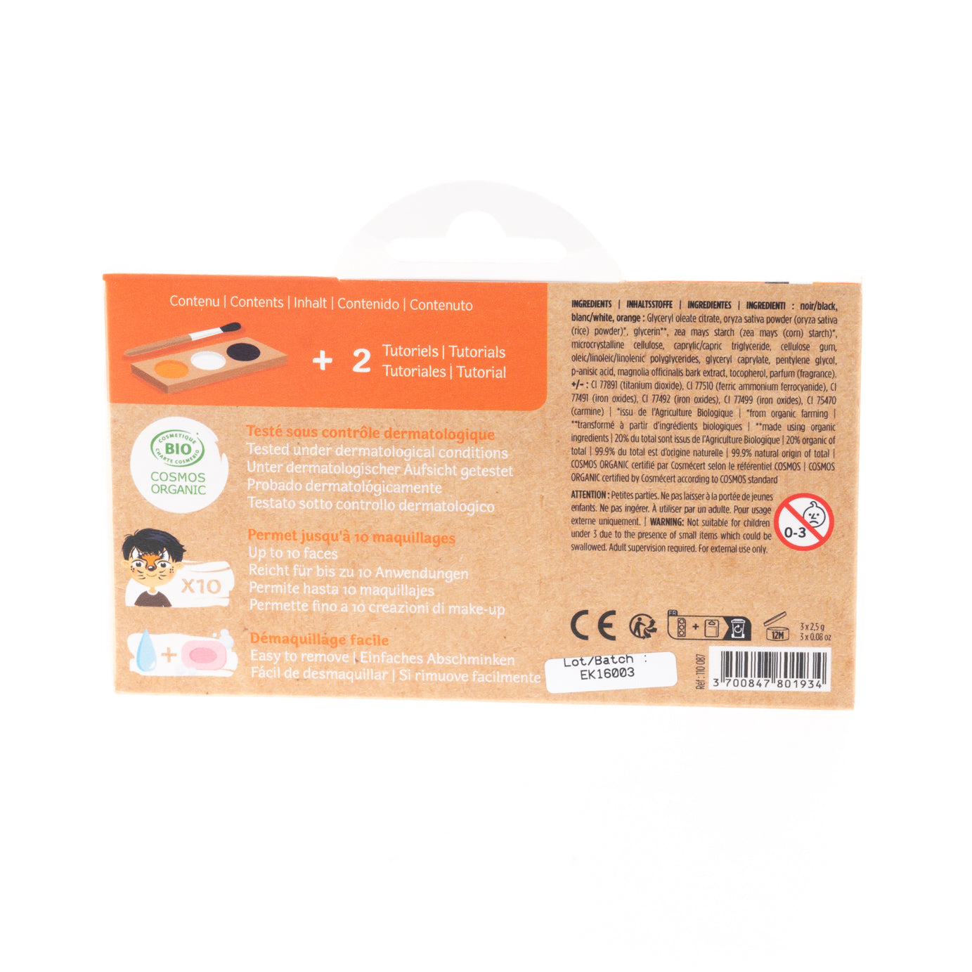 Devenez un tigre ou un renard grâce à ce kit de maquillage à l’eau certifié bio et hypoallergénique contenant une palette de 3 couleurs (orange, blanc, noir), 2 modèles de maquillage et 1 pinceau.